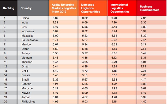 Trung Quốc và Ấn Độ đứng đầu bảng xếp hạng năm 2019 về quy mô và sức mạnh thị trường logistics trong nước và quốc tế. Dù vậy, khảo sát cho thấy 2 quốc gia này bị đánh giá kém hơn với các nước nhỏ về các nền tảng kinh doanh, môi trường quản lý, thực thi hợp đồng, các biện pháp đảm bảo chống tham nhũng,.v.v